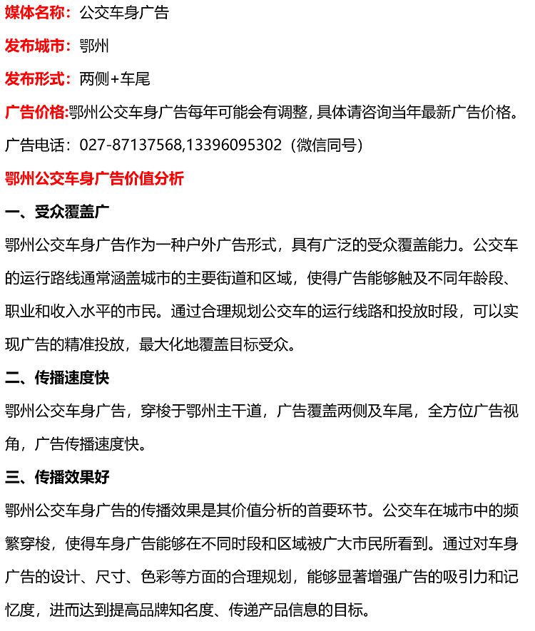 欢迎投放鄂州公交车身广告!鄂州公交车身广告,两侧加车尾同时发布!广告面积大,穿梭于鄂州主干道,广告传播速度快!适合长期发布!为保证广告如期发布,请尽量提前确定广告发布事宜!最新广告投放价格,请咨询!