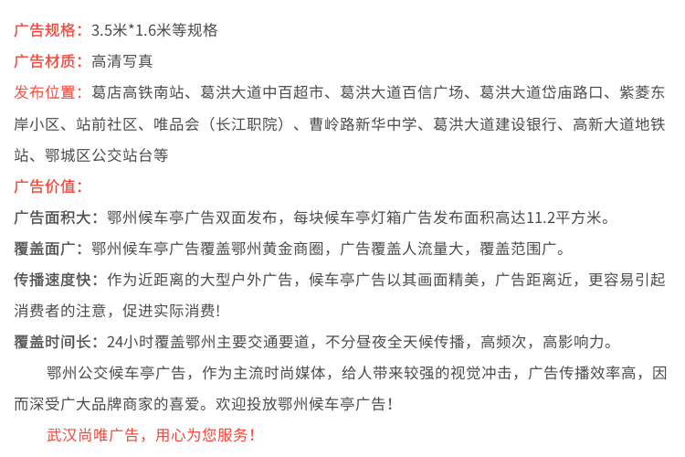 鄂州候车亭广告,覆盖鄂州主干道,超大面积,双面发布,传播迅速!