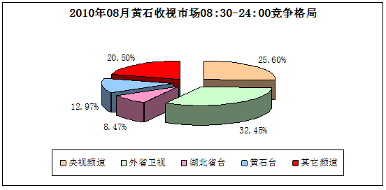 从图1至图3可以看到,从6月到整个8月份,三个板块变化比较大,其中,央视板块的收视份额下降得比较多,掉了9.73个点。从中受益较大的有两个板块:一是外省卫视板块的份额一直处于上升状态,3个月增加了3.10个点,二是黄石台的收视份额的增长幅度也比较大,上升了4.52个点。而湖北省台板块和其它频道板块相对较平稳,湖北省台板块略有下降,其它频道板块略有上升。