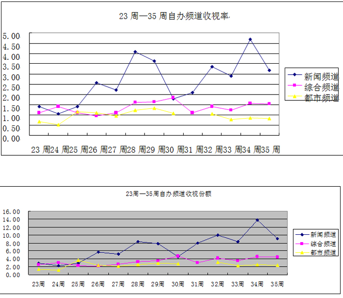 为了更好地对比分析,我们还对三个月(从5月31日至8月29日)共13周的周均收视率和收视份额进行了统计,从折线图可以看出,无论是收视率,还是收视份额,新闻频道对黄石台市场竞争份额的提升贡献最大,但新闻频道的波动也最大,表现不是很稳定。而综合频道和都市频道的收视率和收视份额变化不是很大,相对较平稳。