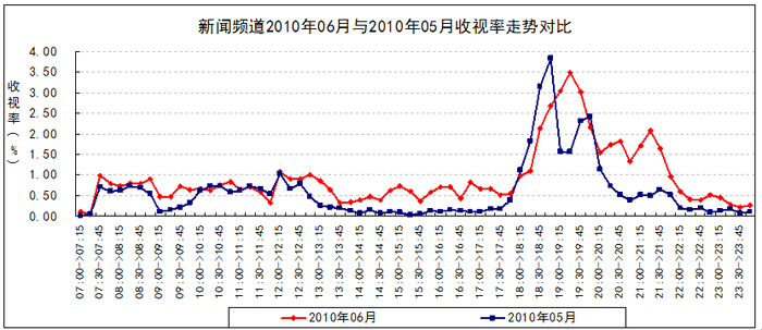 新闻频道在早间7:30至8:45左右和中午的12:00至13:00时段的收视数据略有上升,最高值在一点几,突出的是在晚上黄金时段的收视率上升得比较快,幅度比较大,尤其是7、8月份表现突出,从17:50左右开始抬升,到19:20左右达到最高峰值(三个月中收视率最高峰值为6.09),后略有下降,到21:30左右达到第二个峰值,