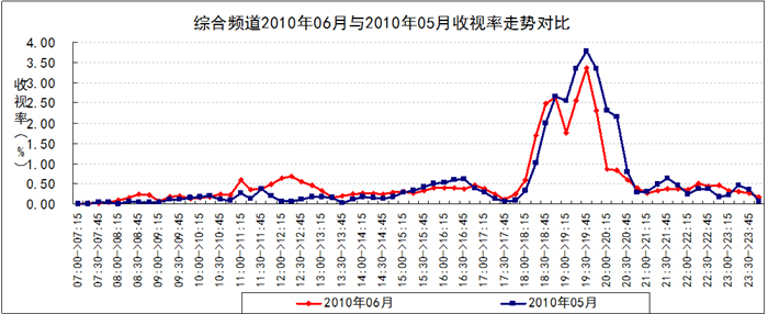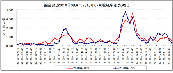 从综合频道的日平均收视曲线图中我们可以看到,7、8月份在11:45至13:00时段出现第一个峰值,晚上黄金时段,在18:15至20:00之间出现第二个峰值,最高3.75的收视率出现在19:00左右,从19:45开始收视率急剧下降,到21:00左右降至谷底,此后直到22:00收视率稍有回升。