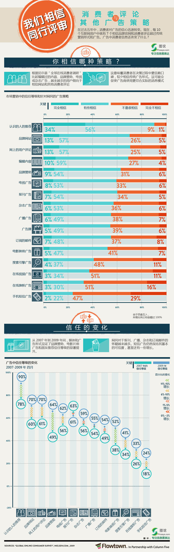 好的口碑会为一个商品或服务带来越来越多的顾客,相比于电视、杂志、报纸和广播广告,消费者更倾向于相信网络上消费者的评论,这也是淘宝卖家如此重视信誉与评价的原因。本幅信息图列举了各式各样的营销途径以及消费者的反应。