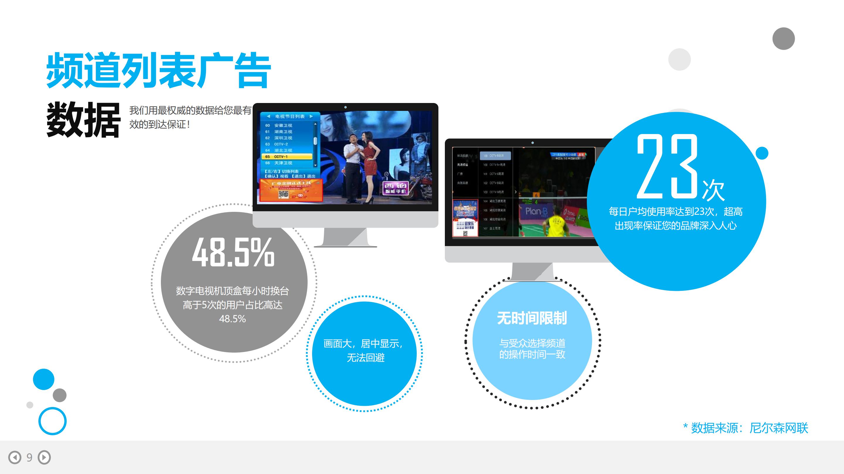 数字电视新媒体广告是基于数字电视机顶盒的新型媒体形式,多伴用户操作出现,是全新的、强效的、高端的大众广告载体。突破传统电视频道时间的分割概念,以文字、图片、视频等多种综合形式出现,是一种崭新的广告资源,同时又具有强制覆盖、超高的性价比,无论是收视成本及千人成本都有绝对优势。
