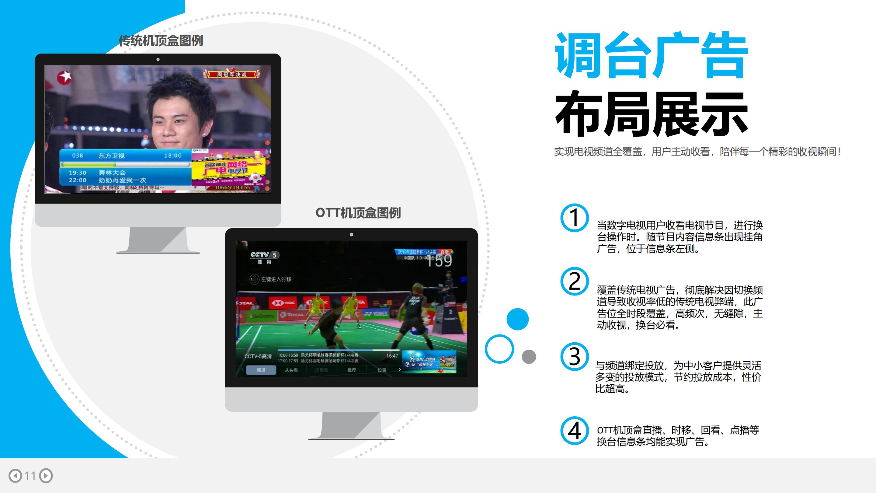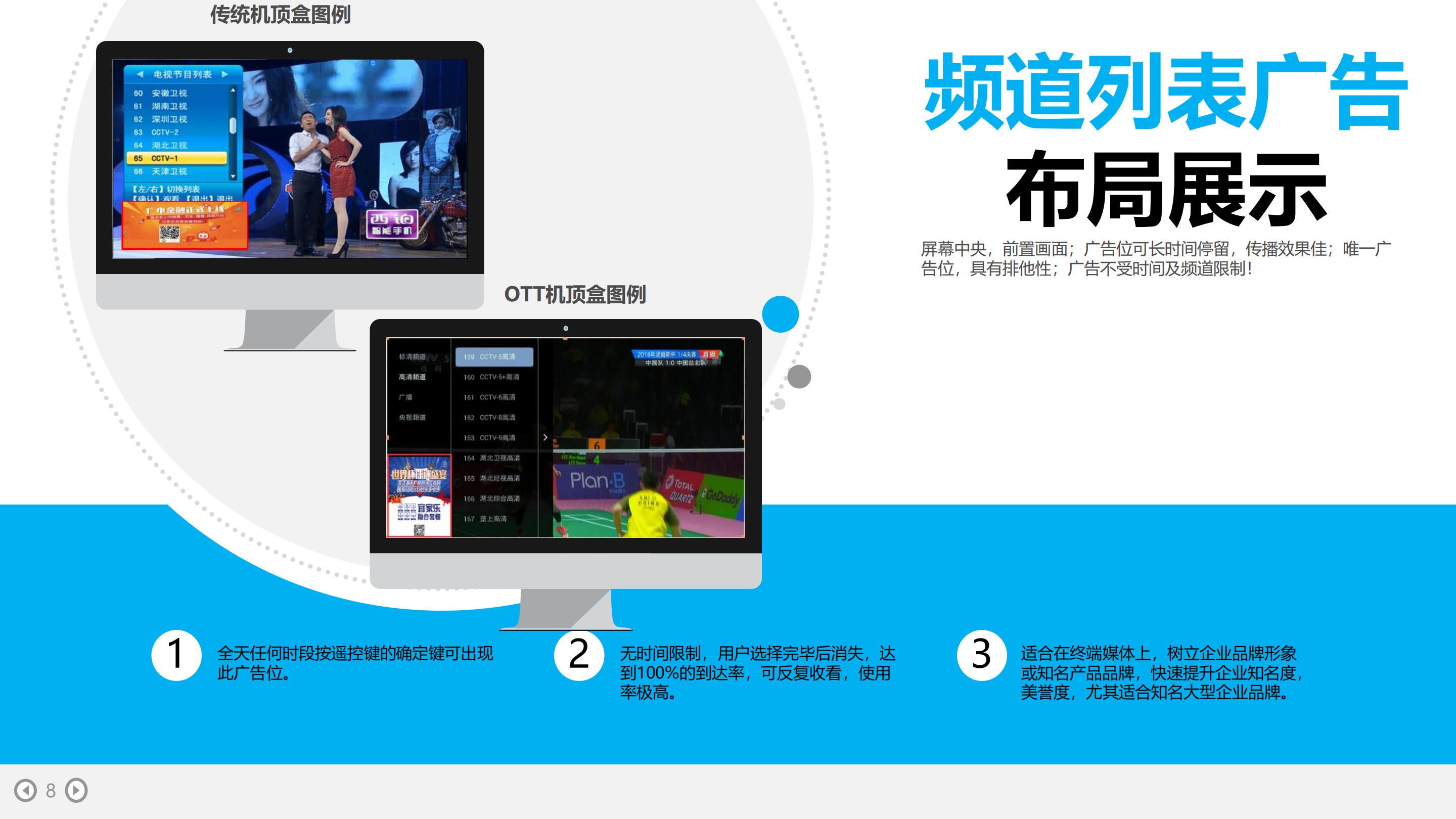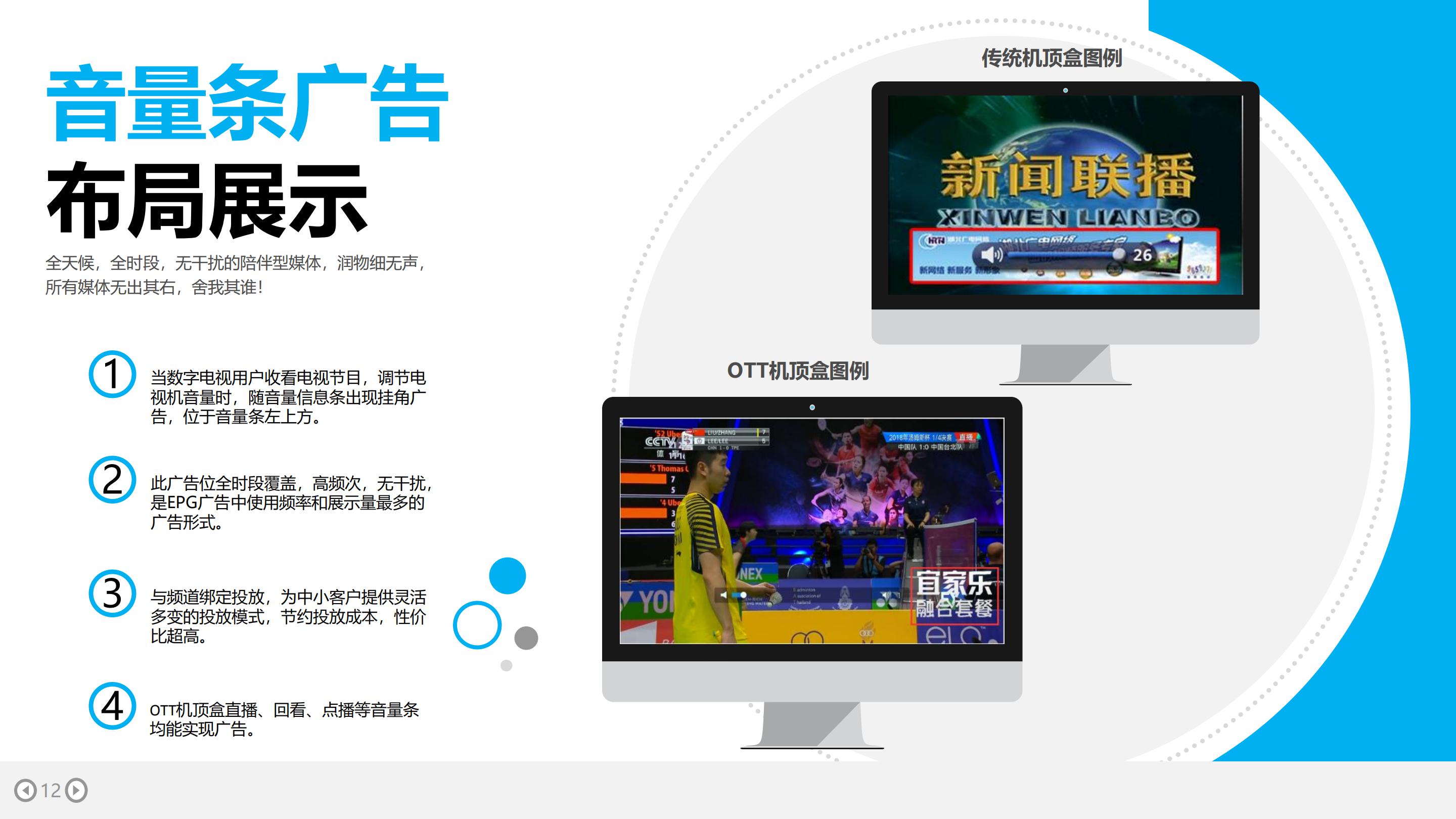 湖北数字电视新媒体的广告形式有:开机画面广告、频道列表广告、调台广告、音量条广告等,具体如下: